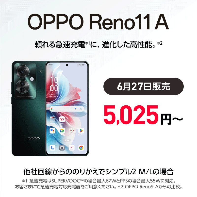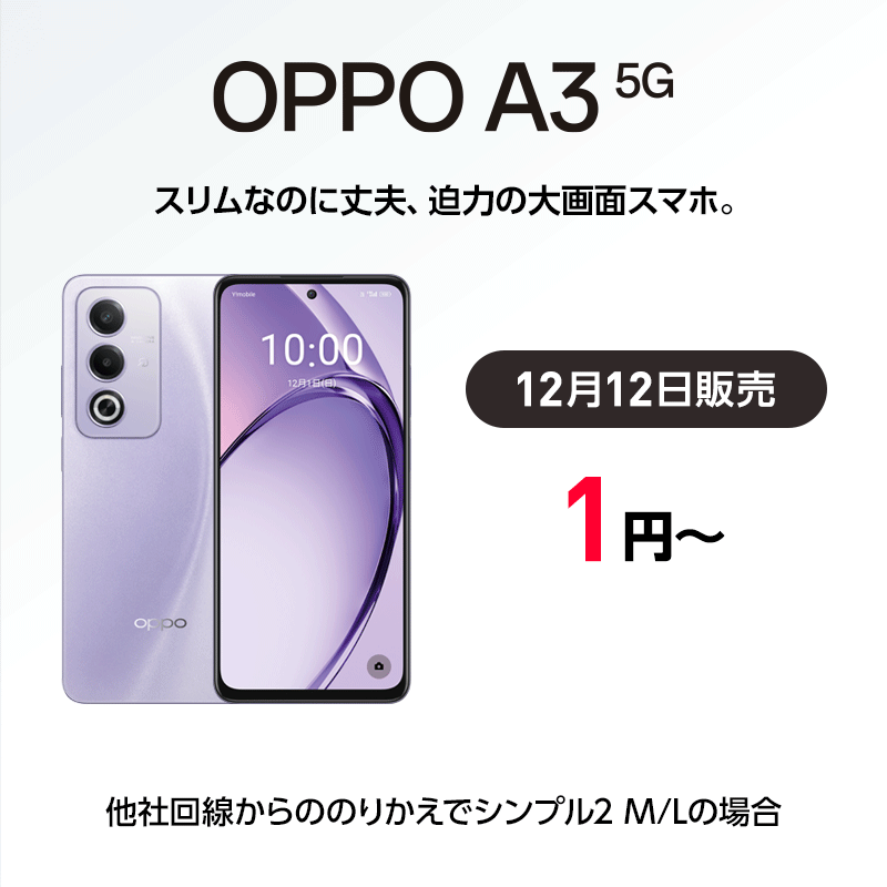 ※OPPO Reno11 A/OPPO A3 5G については180日以内に新規ご契約・他社回線からののりかえの場合、ご契約者1名義につき1台までの販売とさせていただきます。複数注文が確認された場合は、ご注文はキャンセルとなります。何卒ご了承をお願いします。