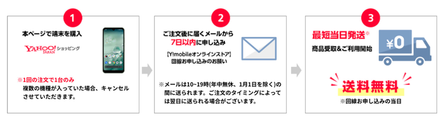 ※ Yahoo!ショッピングでの注文日を1日目として7日目までにワイモバイルオンラインストアでのお申し込みがない場合、ご注文はキャンセルさせていただきます。