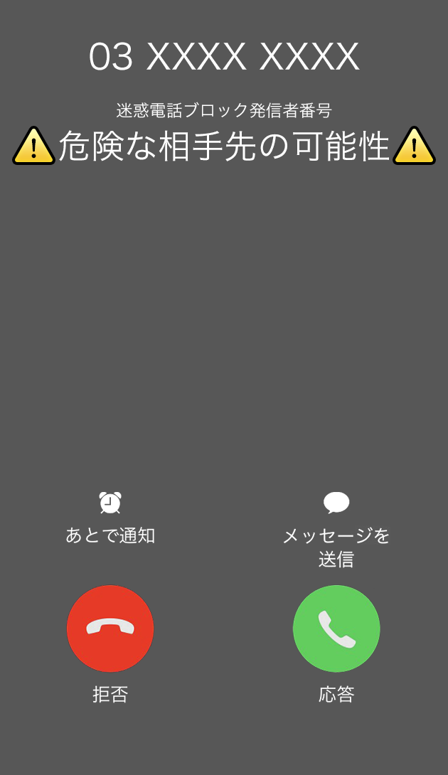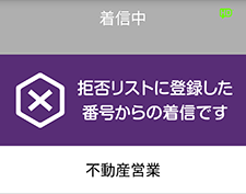 拒否リストに登録した個別の電話番号からの着信時に警告画面を表示します。