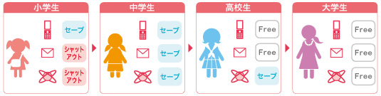 あんしんロックは、使いたくない機能や使わせたくないサービスを制限することができる電話機の機能です。たとえば、通話機能のみに限定しお子さまが初めて手にする“ファーストケータイ”から、使える機能を少しずつ追加してステップアップさせるなど、成長に合わせた使いかたが可能です。