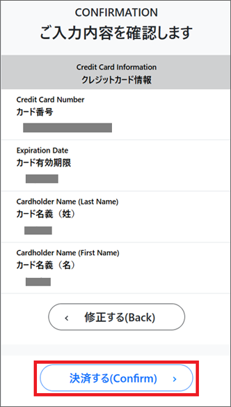 入力内容を確認し、「決済する(Confirm)」をタップ