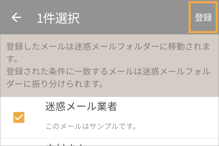 登録したい迷惑メール条件を選択し、「登録」をタップすると迷惑メール条件が登録されます。選択したメールは迷惑メールフォルダーに移動します。